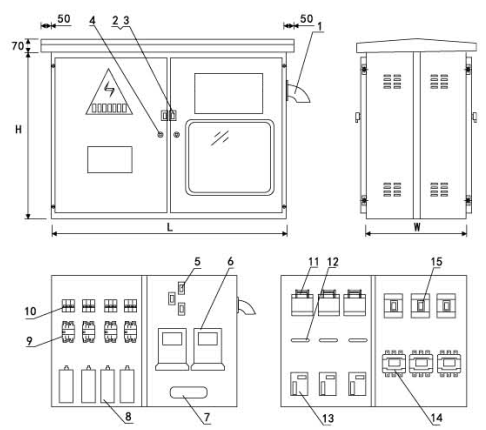 La fuente de alimentación, la medición y las secciones de línea saliente se separan para la claridad funcional. Preventos interferencia mutua y mejora la seguridad durante la operación e inspección.